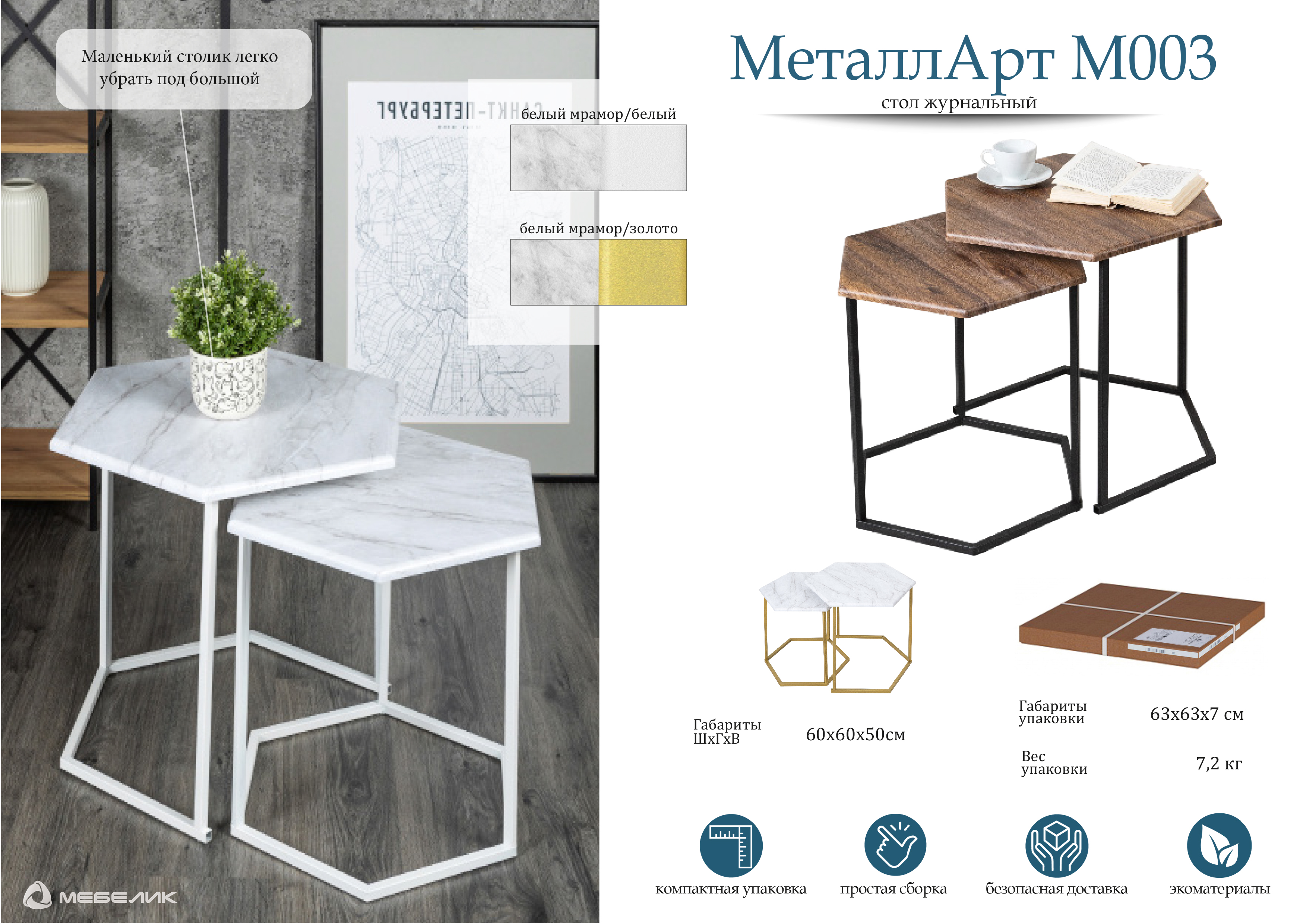 Журнальные столики МеталлАрт М003 выполнены в форме шестиугольника, что придаст вашему интерьеру стильный и оригинальный вид. Столешница из МДФ, покрытая пленкой ПВХ, обеспечивает устойчивость к высоким температурам и износостойкость. Металлический каркас гарантирует надежность и устойчивость к ударам и царапинам. Маленькая модель легко убирается под большую, экономя пространство и создавая дополнительные возможности для использования. В комплекте предусмотрены накладки из искусственного фетра для защиты пола. Материалы: МДФ+плёнка, металл Упаковка:63*63*7 см, 1 место Вес: 7,4 кг Цвет: коричневый дуб/черный, белый мрамор/белыйХарактеристики