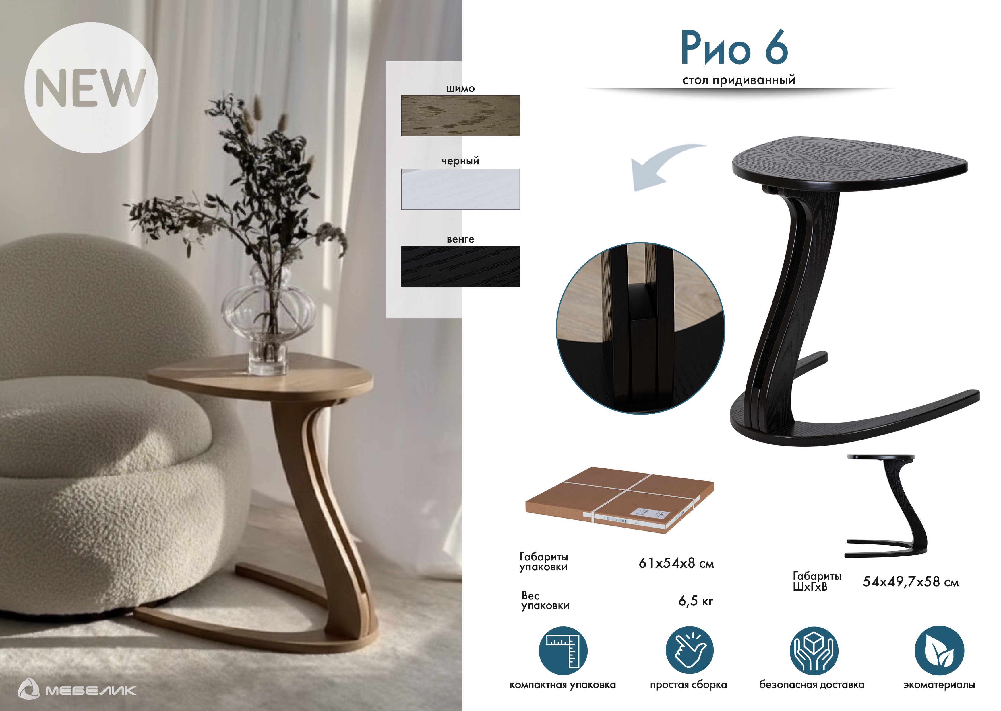 Журнальный стол Рио 6 — это новый впечатляющий акцент для вашего домашнего интерьера. Стол выполнен из качественного шпона берёзы. Надёжные материалы гарантируют долгую службу изделия и сопротивление износу. Основание имеет вид бумеранга, а изогнутая опора подчёркивает изящество столешницы в форме мягкого треугольника. Всё это придаёт Рио 6 современный технологичный стиль. Данный стол крайне функционален. Он справится с ролью журнального, приставного или прикроватного. На ваш выбор предоставлены три стильные расцветки. Материалы: Шпон березы, эмаль, лак Упаковка: 61*54*8 см Вес: 6,5 кг Цвет: белый, венге, шимоХарактеристики