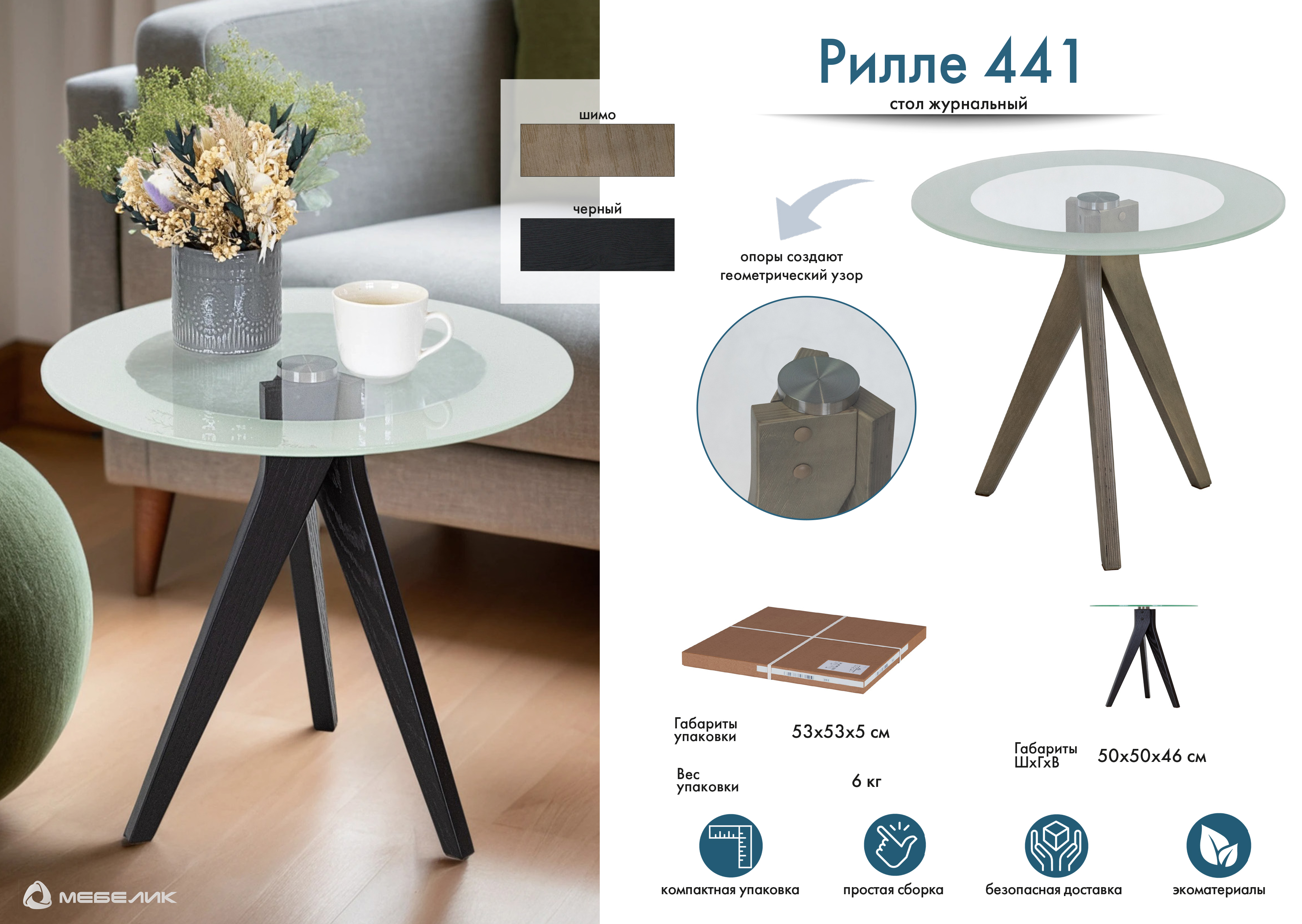 Журнальный столик Рилле 441 – это изящный и компактный предмет мебели, подходящий для любого интерьера от классики до лофта. Рилле 441 прекрасно справляется с ролью как журнального, так и прикроватного или придиванного столика. Опоры, выполненные из шпона берёзы (толщиной 24 мм), обеспечивают устойчивость, надёжность и долгую службу, а покрытие эмалью и тиснение с имитацией рисунка дерева придают столику естественную красоту. Обрамление круглой столешницы диаметром 500мм из стекла (8мм) пескоструйным рисунком шириной 80мм и минималистичный геометрический узор, который создают опоры, формой напоминающие бумеранг, подчеркнут уникальность любого интерьера. Материалы: стекло, шпон березы Упаковка: 53*53*5 см, 1 место Вес: 6кг Цвет: черный/стекло прозрачное, шимо/стекло прозрачноеХарактеристики