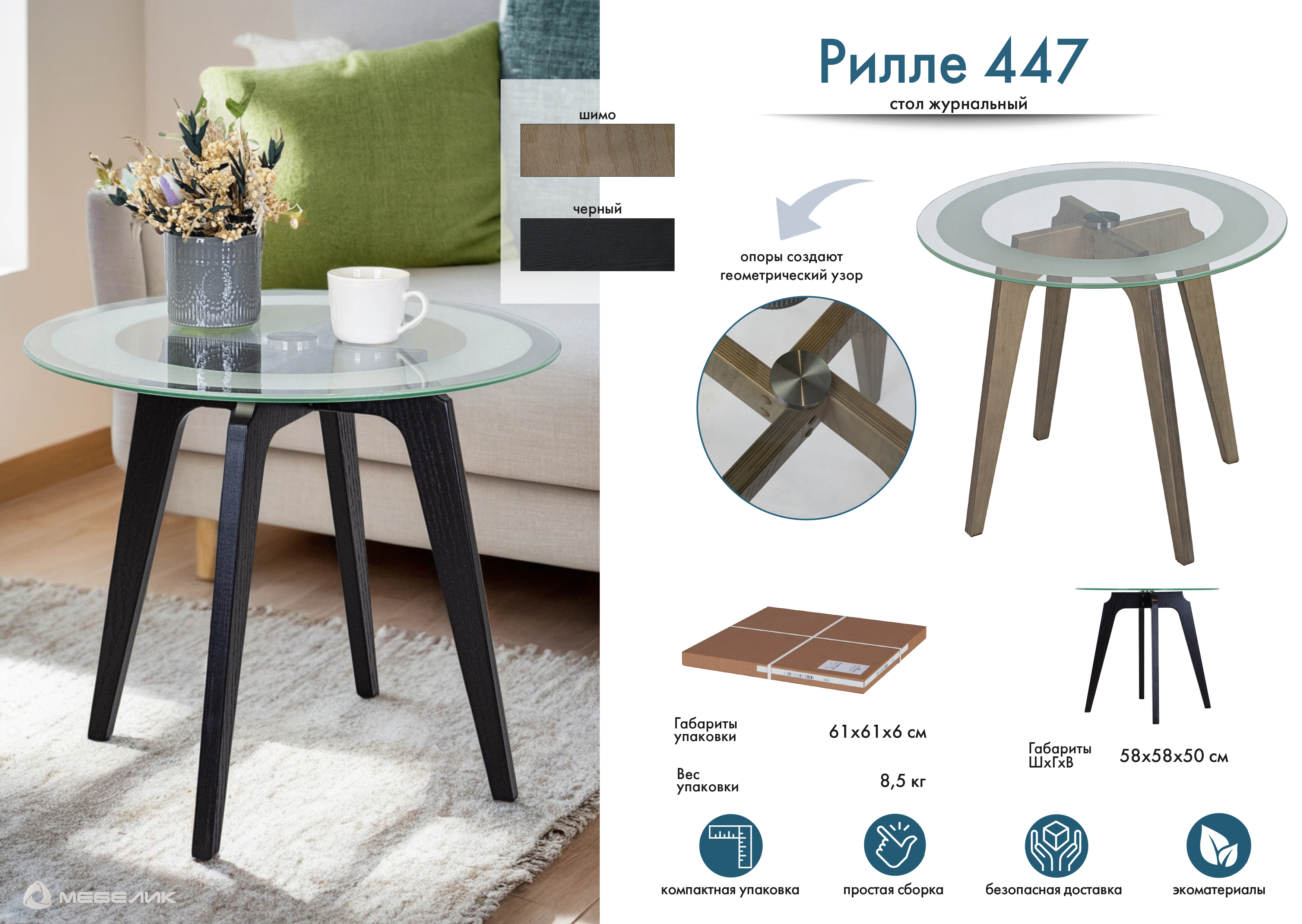 Журнальный столик Рилле 447 – это утончённый и компактный предмет мебели, подходящий для любого интерьера от классики до лофта. Рилле 447 прекрасно справляется с ролью как журнального, так и прикроватного или придиванного столика. Четыре опоры, выполненные из шпона берёзы (толщиной 24 мм), обеспечивают устойчивость, надёжность и долгую службу, а покрытие эмалью и тиснение с имитацией рисунка дерева придают столику естественную красоту. Изящность столешницы диаметром 580мм из стекла толщиной 8мм подчёркивает эстетичный пескоструйный рисунок шириной 70мм, создающий внутреннюю окружность. В сочетании с геометрическим крестообразным узором он добавит уникальности любому интерьеру. Материалы: Стекло, шпон березы Упаковка: 61*61*6 см Вес: 8,5 кг Цвет: шимо/стекло прозрачное, черный/стекло прозрачноеХарактеристики