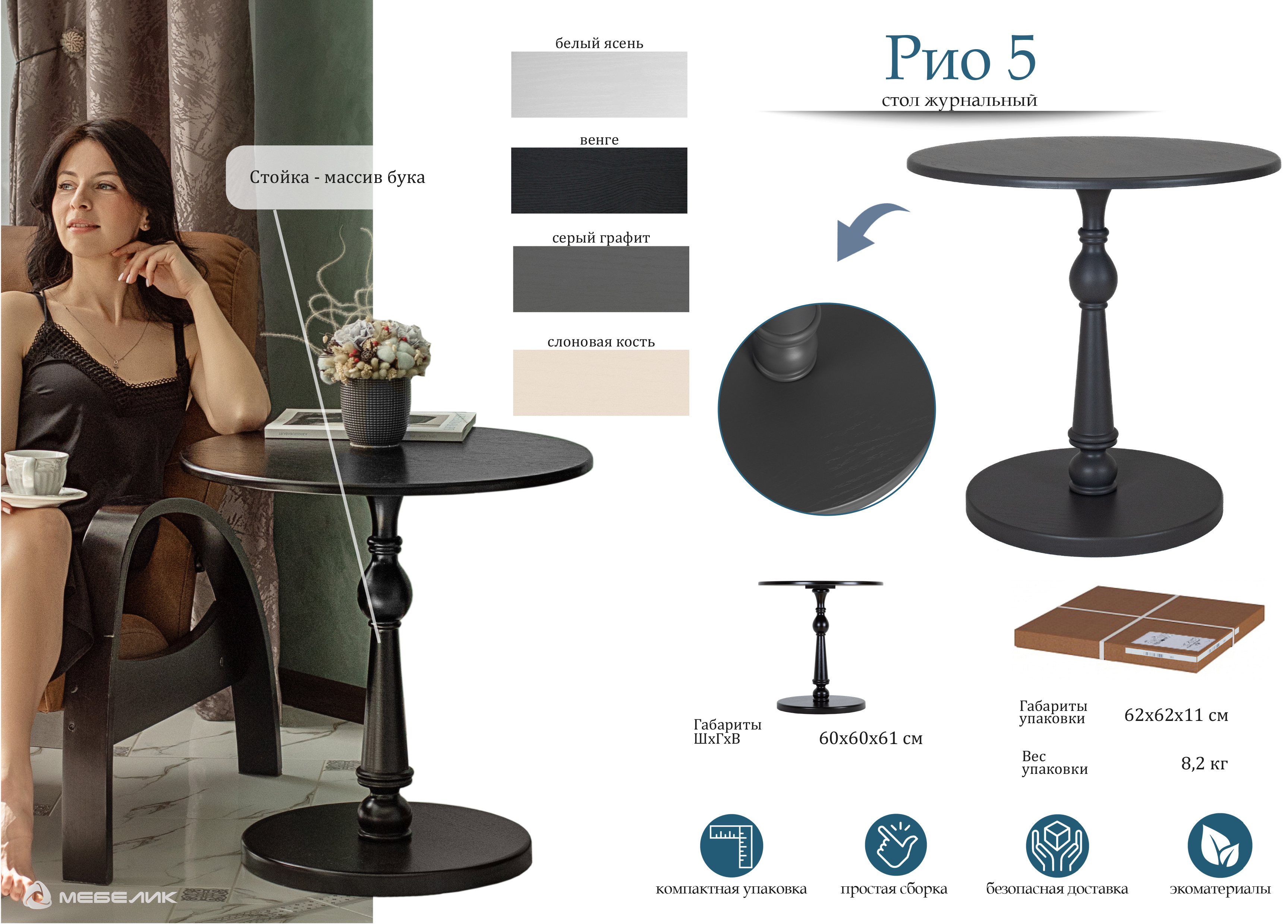 Классический столик, в тоже время вполне подходит в современный интерьер Мощное устойчивое основание, очень удобный размер столешницы Правильно подобранная высота столика позволяет использовать его практически в любом интерьере Поверхность столика - натуральный дуб, все детали покрыты матовым лаком Очень легко собирается, не требует специального ухода ___ Журнальный столик с деревянной столешницей - не только украшение интерьера, но и весьма полезная в повседневной жизни вещь. Имея в своей обстановке журнальный столик, вы сможете хранить на нем тысячу ненужных вещей, сможете его быстро сервировать для нежданных гостей, редко, но сможете использовать его как стол письменный, кухонный, сервировочный, кофейный, или как туалетный столик. Стол журнальный - универсальная вещь. При выборе обратите внимание не только на габаритные размеры, но особенно на высоту. Если он будет стоять около дивана, то это особенно важно. Некрасиво, когда поверхность журнального стола выше сиденья, но и слишком низкие журнальные столики не всегда удобны - придется нагибаться. Сделайте свой выбор, а мы позаботимся о том, чтобы покупка стала для вас приятной. Материалы: столеш., основание - МДФ, опора - массив Упаковка: 62*62*11 см., 1 место Вес: 8,2 кг Цвет: белый ясень, венге, слоновая кость, серый графитХарактеристики