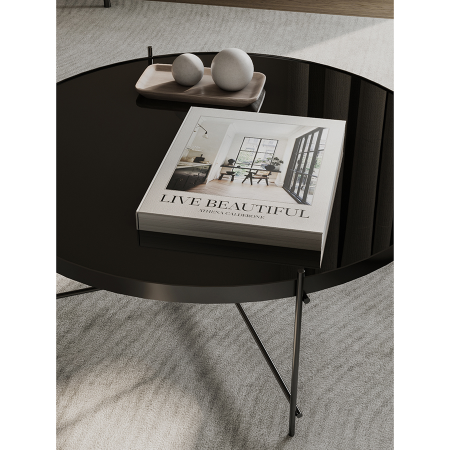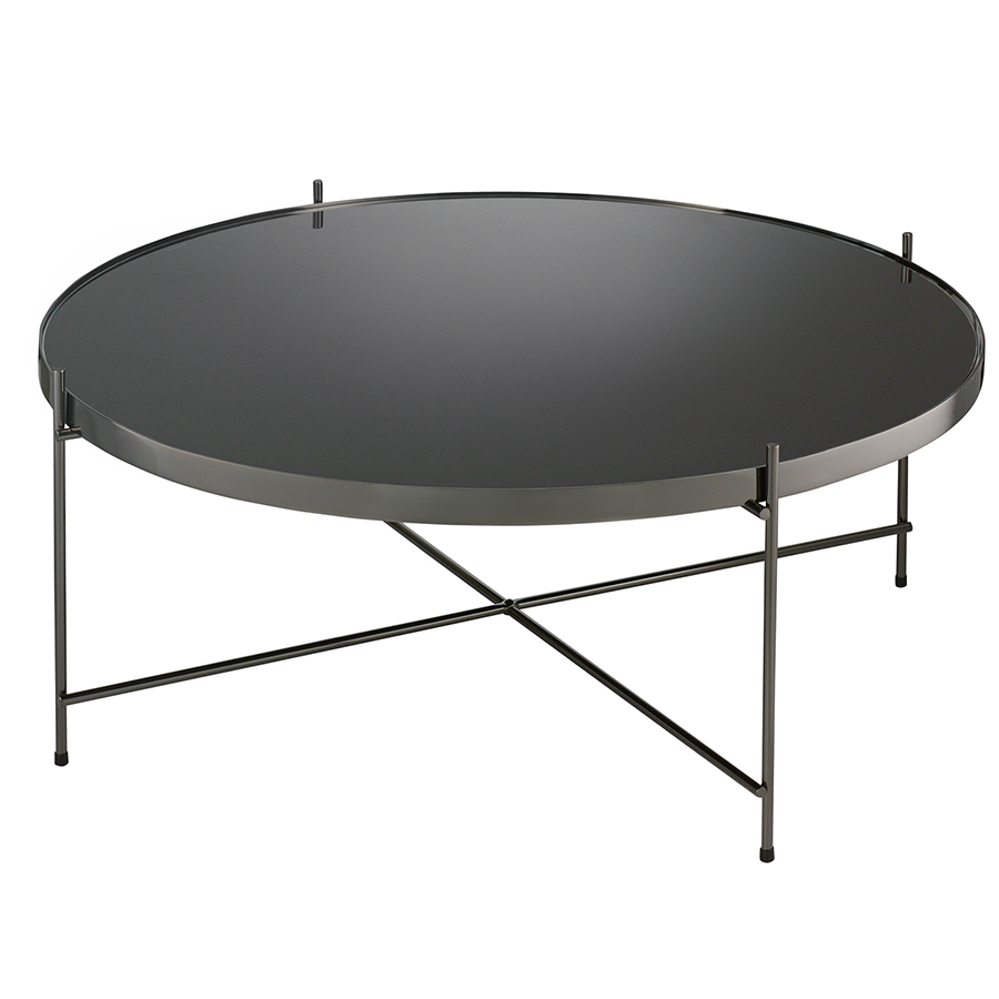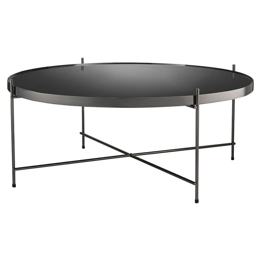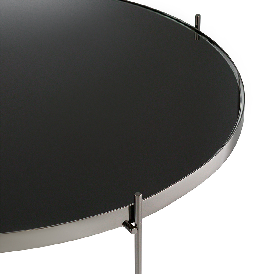 Материалы: столешница – черное закаленное стекло, каркас – сталь с покрытием черный никель. Размеры: диаметр – 84,8 см, высота – 33 см.