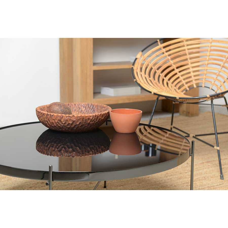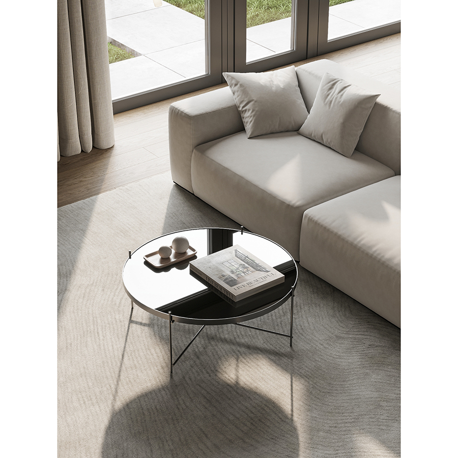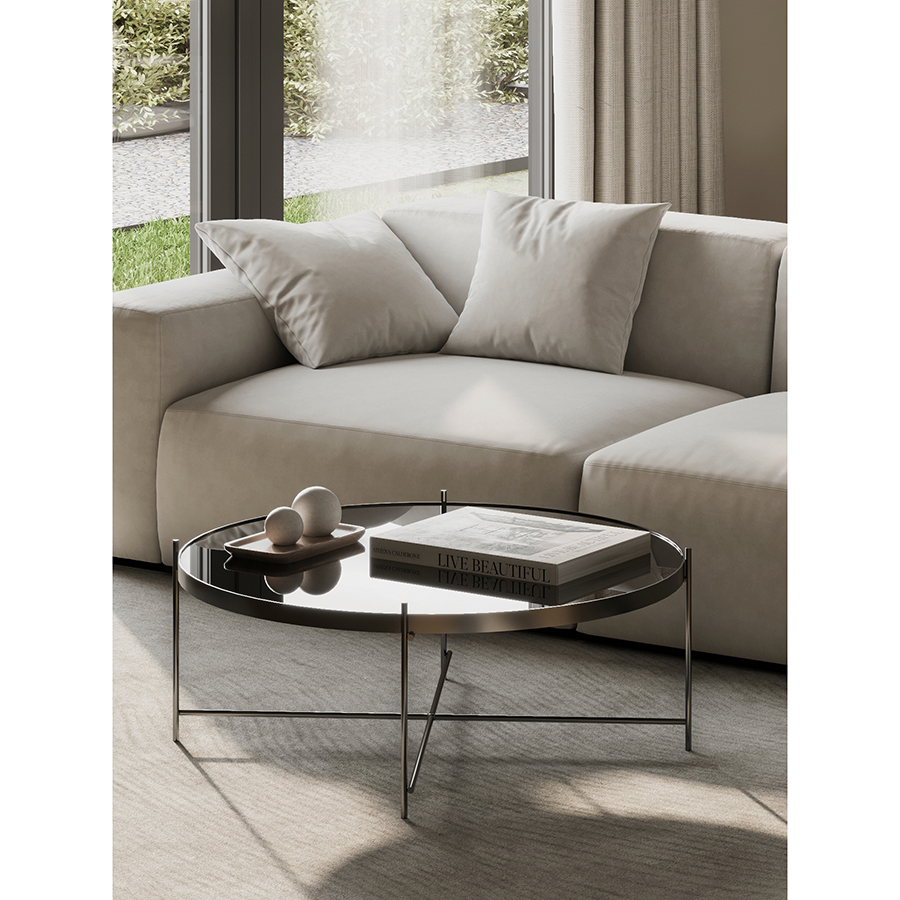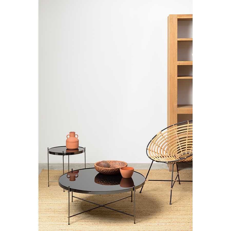 Материалы: столешница – черное закаленное стекло, каркас – сталь с покрытием черный никель. Размеры: диаметр – 84,8 см, высота – 33 см.