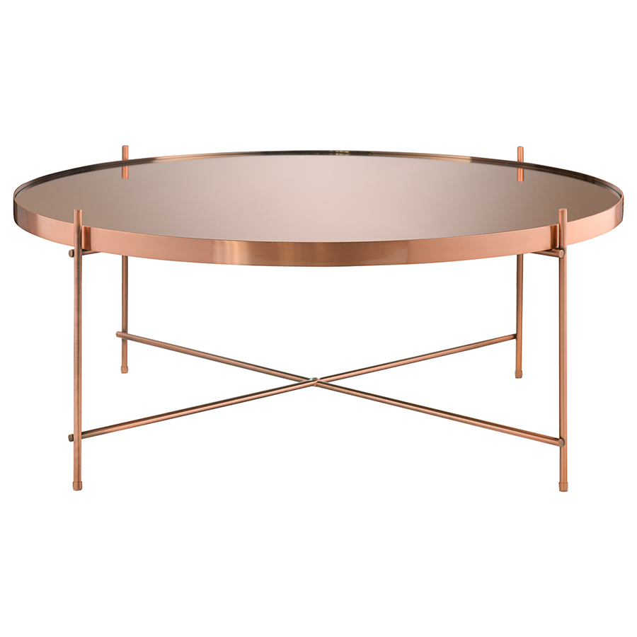 Материалы: столешница – розовое зеркало, каркас – сталь с медным покрытием. Размеры: диаметр – 84,8 см, высота – 33 см. Максимальная нагрузка: 30 кг.