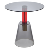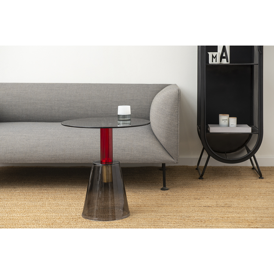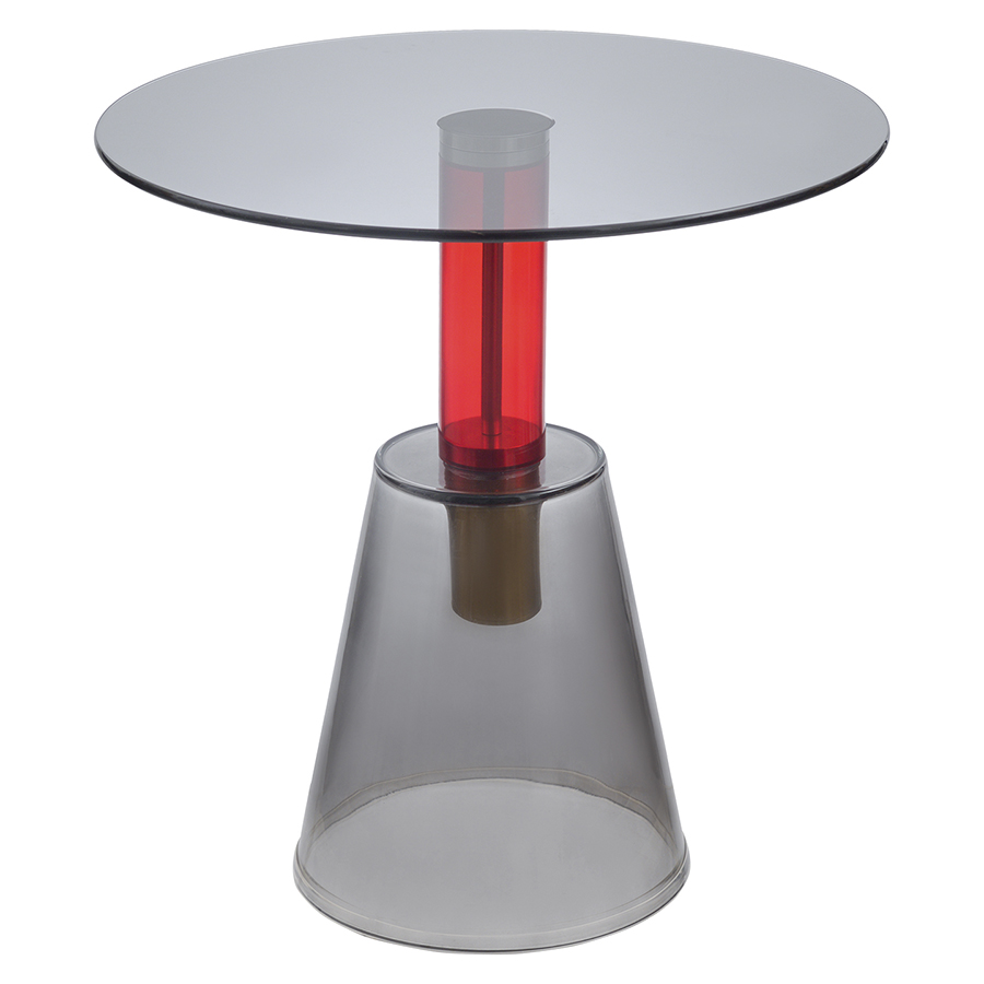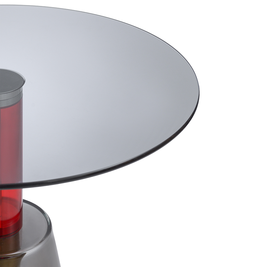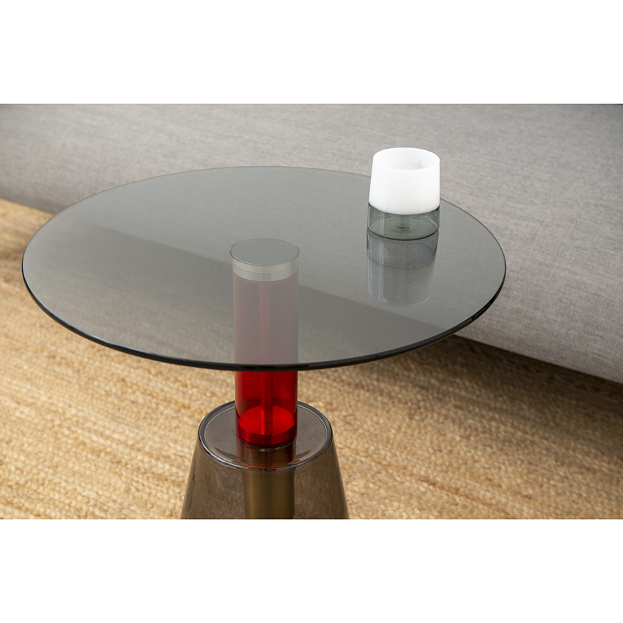 Кофейный столик Amalie привлекает внимание необычным дизайном – все элементы конструкции выполнены из стекла. Столешница и основание имеют серый оттенок. Ярким акцентом выступает ножка красного цвета. Такой предмет мебели органично вписывается в различные интерьерные стили: минимализм, фьюжн, поп-арт, хай-тек и др.Материал: стекло. Максимальная нагрузка - 15 кг. Диаметр: 50 см. Высота: 52 см. Цвет: серый/красный.
