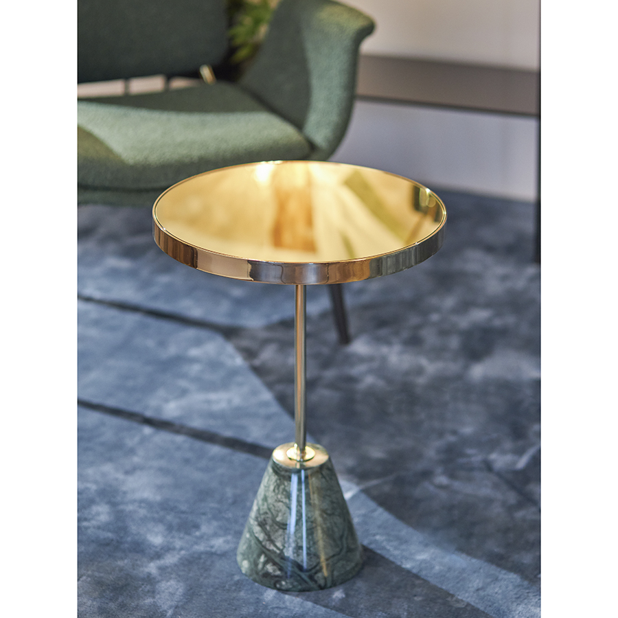Материалы: столешница – зеркало золотистого оттенка, каркас – сталь, основание – мрамор. Размеры: 40,8х40,8х50,3 см. Цвет: золотистый/зеленый.
