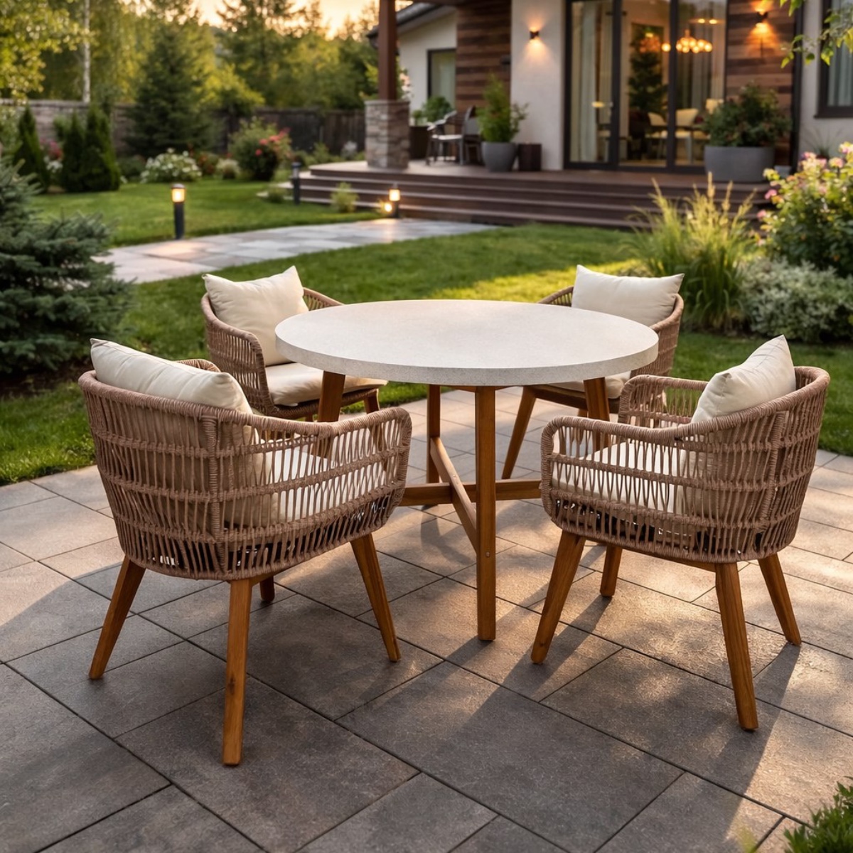 Комплектация и габариты: Стол - 120х120х76 см Стул (4 шт.) - 63х63х80 см Материалы: Материал кресла - Акация Материал обивки - роуп(уличная веревка) Материал чехла на подушки - Olefin (водоотталкивающая ткань) Материал наполнителя подушек - пенополеуретан/ холлофайбер Цвет каркаса - акация Цвет подушек - бежевый Дополнительная информация: Максимальная нагрузка - 150 кг Чехлы съемные - да Температурный режим - от -50॰C до +50॰C Держатели и крепления подушек зависят от поставки и не являются неотъемлемой частью комплекта Гарантия и эксплуатация: Гарантийный срок - 1 год Эксплуатационный срок - 10 лет Страна производитель - ВьетнамХарактеристики